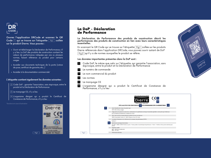 Grâce à un QRCode présent sur l’étiquette collée sur le montant de la porte, vous pourrez récupérer divers documents : Déclarations de Performances (DoP) et d’ici quelques temps documentation techniques (notice de pose, certificats de garantie…) ainsi que de la documentation commerciale.